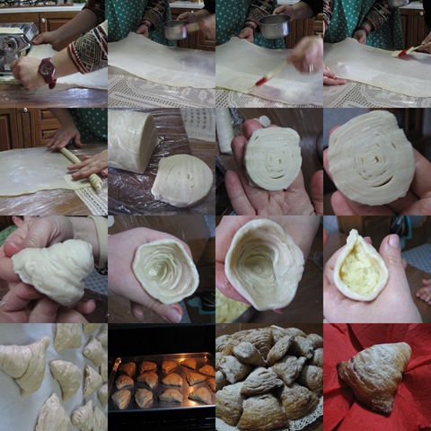 Prendete un pezzo di sfoglia e tiratelo sottile, usando la macchina per stendere la pasta fino all'ultima tacca. Poi, mentre state stendendo la pasta all'ultimo giro, iniziate ad allargare la pasta mettendo le mani sotto la sfoglia e muovendole verso l'esterno. Poi spennellate la sfoglia , e arrotolate la sfoglia, facendo attenzione a non romperlae lasciando un lembo dove far aderire la sfoglia successiva. Proseguite con un altro pezzo di impasto, stendetelo, fatelo aderire alla sfoglia precedente, spennellate ed arrotolate. Continuate così, fino ad ottenere un rotolo di 5 cm almeno di diametro (maggiore sarà il diametro, più grande sarà la sfogliatella). Tagliate le estremità, se dovessero risultare asimettriche, avvolgete il rotolo in pellicola trasparente e conservate in frigo per tutta la notte o in freezer per diverse ore. Tagliate il rotolo a fette di 1,5 - 2 cm e, partendo dal centro, cominciate a spingere, usando la pressione dei pollici, verso il basso, cercando di far separare (ma non del tutto) le varie strisce (che si sono formate quando si è formato il rotolo) e formando una sorta di conchiglia, che andrà riempita con un cucchiaio di ripieno e poi sigillata. Infornate ad alta temperatura, almeno 200 C - la temperatura dipende dai forni, ma deve essere forte - e cuocete per 15-20 minuti, finchè le sfogliatelle risulteranno croccanti e dorate.